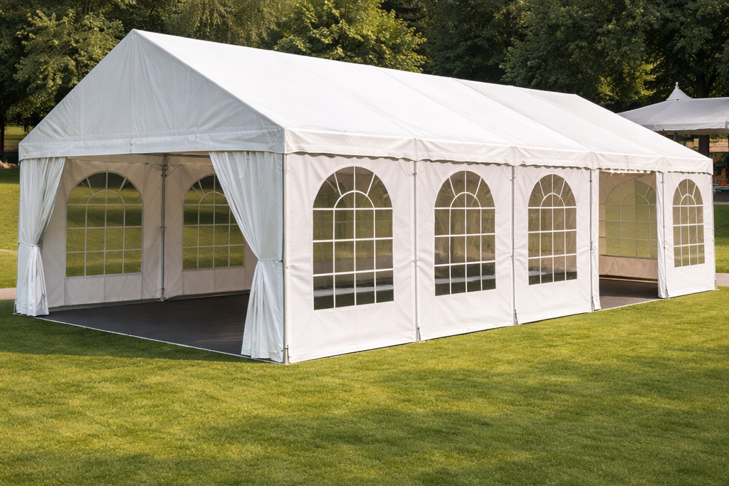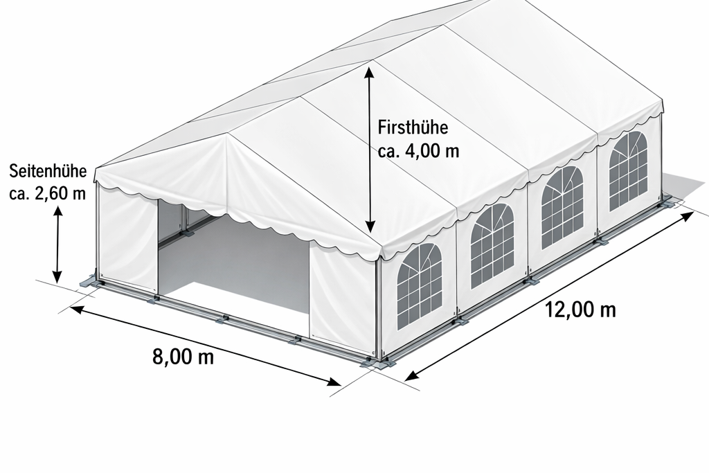 Dieses 8×12 Meter große Premium-Zelt bietet mit 96 m² eine beeindruckende Fläche für ca. 120–130 Gäste (Sitzplätze). Dank extra hoher Seitenwände und massiver Konstruktion ist es die perfekte Wahl für Hochzeiten, Firmenjubiläen oder große Vereinsfeste.
