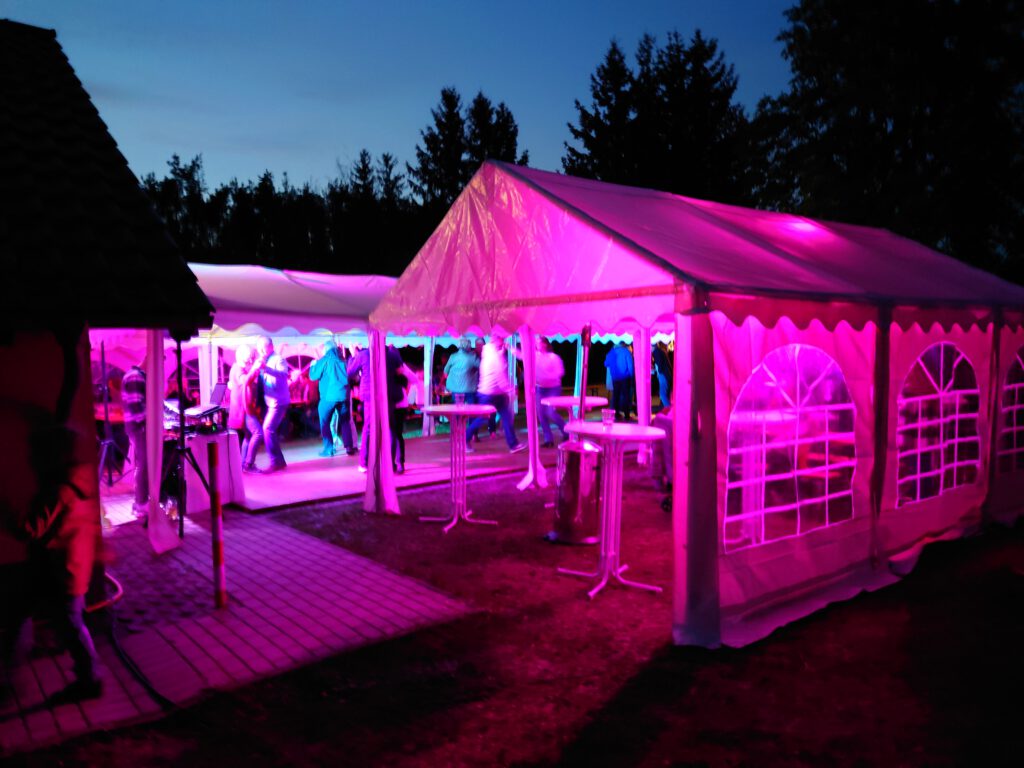 - Kapazität: Platz für ca. 32 Sitzplätze (an 4 Bierzeltgarnituren) oder ca. 45–48 Stehplätze.
